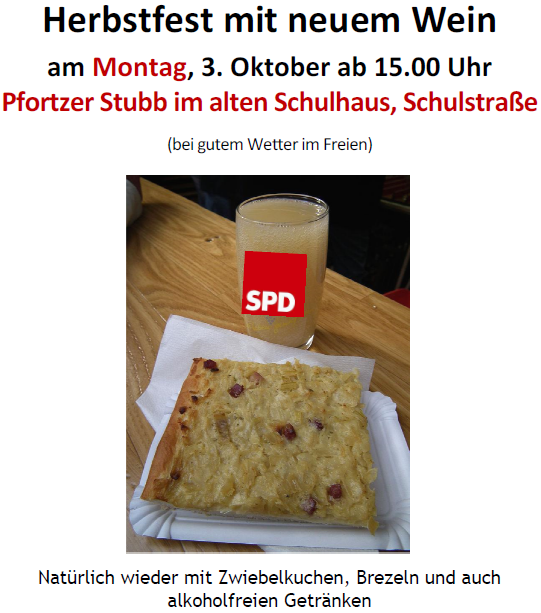 Zum diesjährigen traditionellen Herbstfest mit neuem Wein am 3. Oktober ab 15 Uhr in der Pfortzer Stubb lädt der Ortsverein Maximiliansau alle Bürgerinnen und Bürger ein.